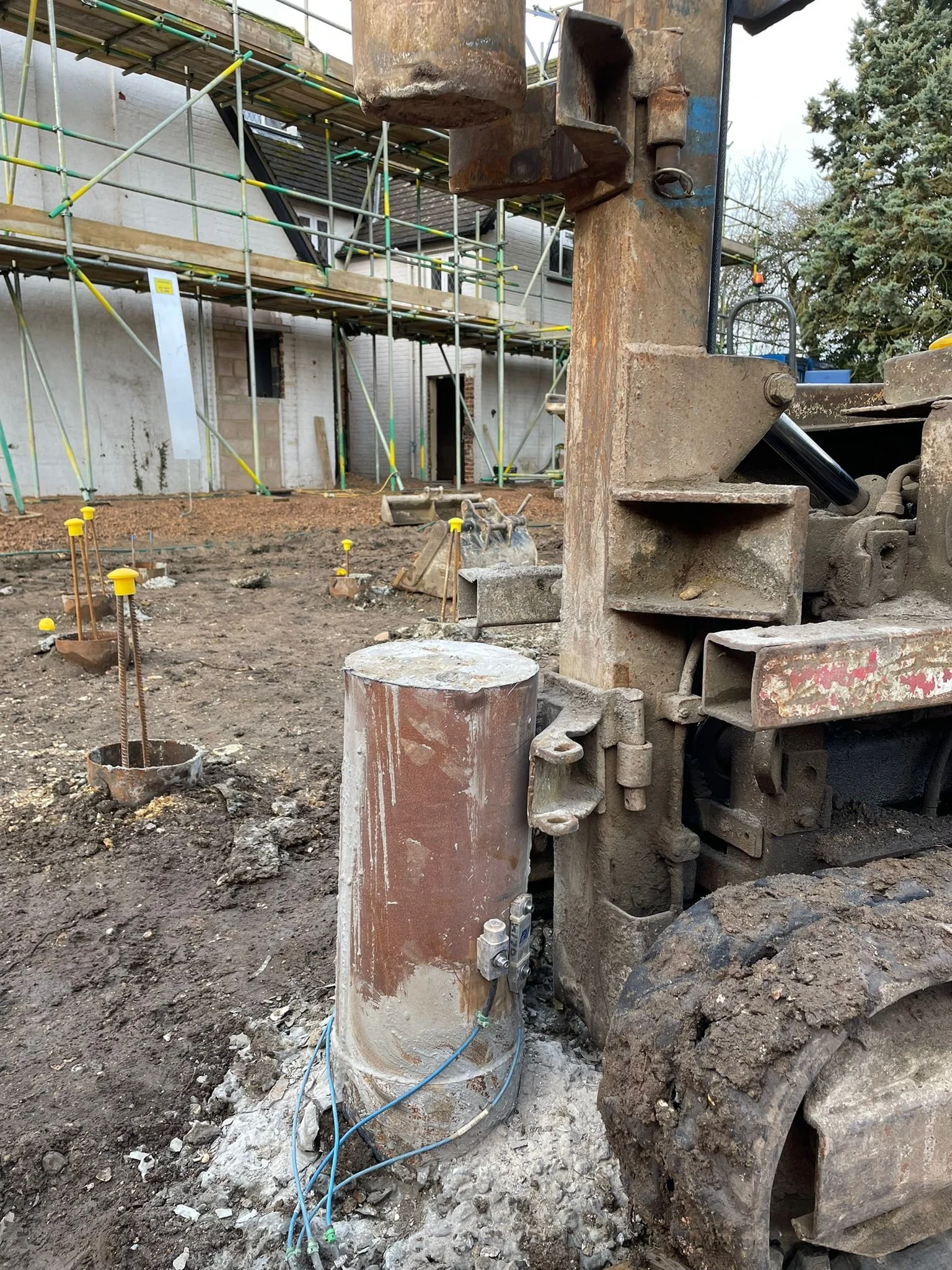 We can test all types of piles. Here we’re testing bottom driven steel cased piles with a D500 drop hammer at a residential development near Reading. We carried out the CAPWAP analysis concurrently to speed up delivery of the report and keep the project moving.